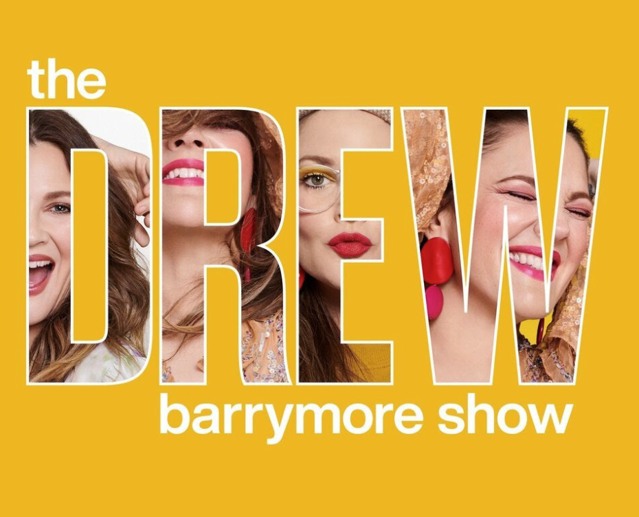 Poster for the Barrymore Show with the word 'DREW' filled with images of four women smiling and posing, on a yellow background.